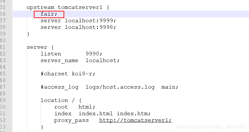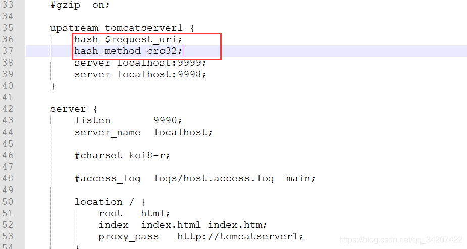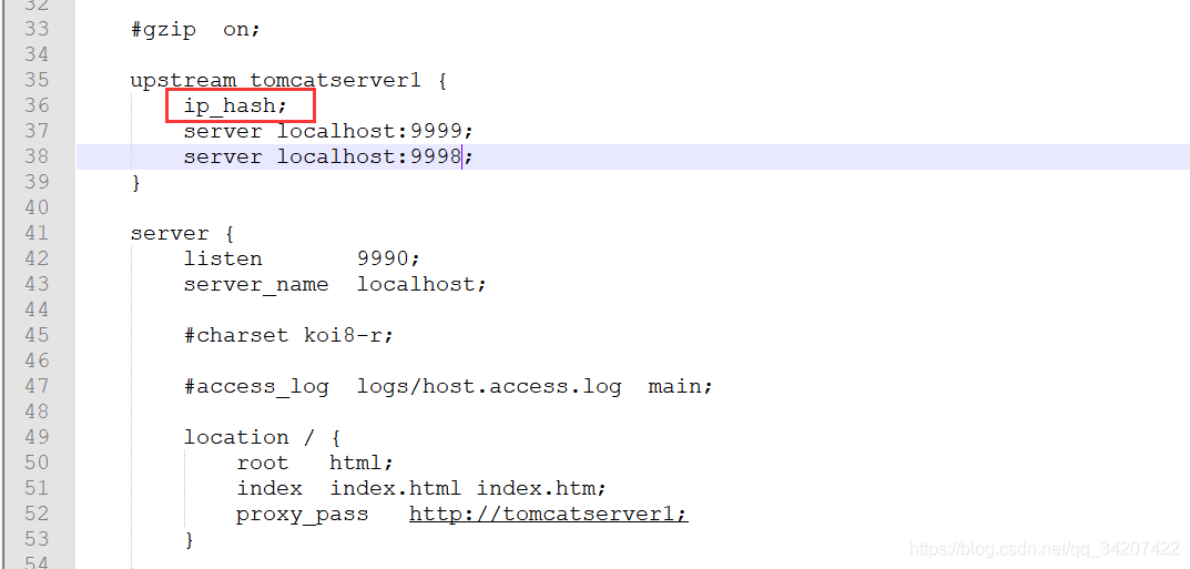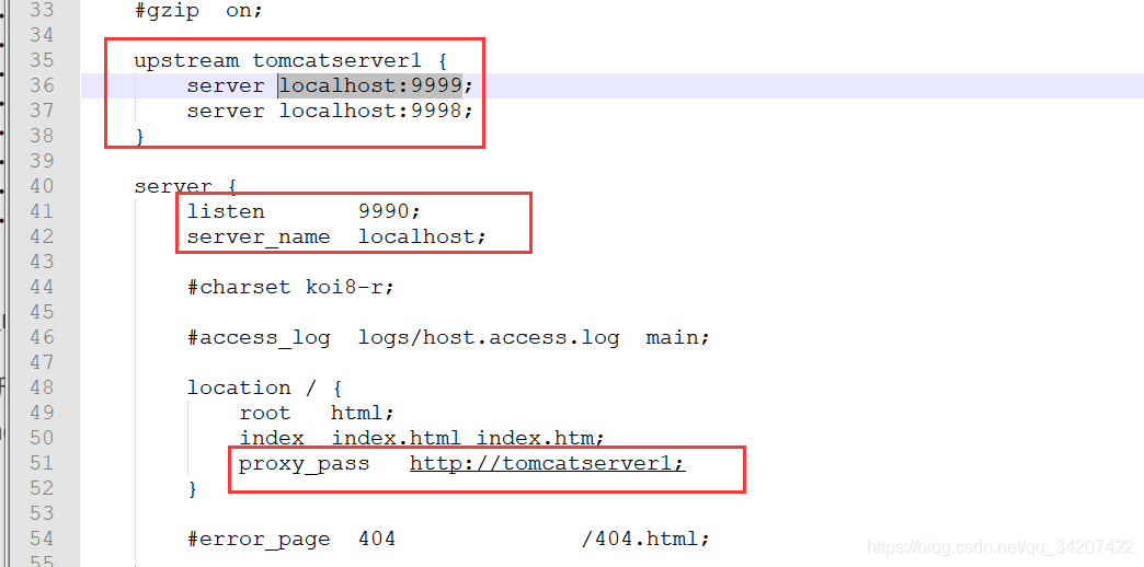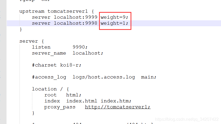 配置监听的地址和端口localhost 9990,通过(upstream)定义一个变量tomcatserver1配置负载均衡的多个节点(localhost:9999,localhost:9998),指定代理到tomcatserver1,具体如下图