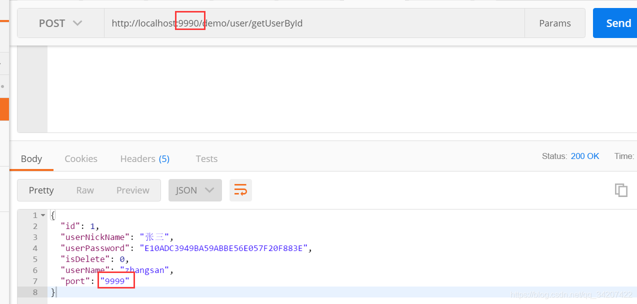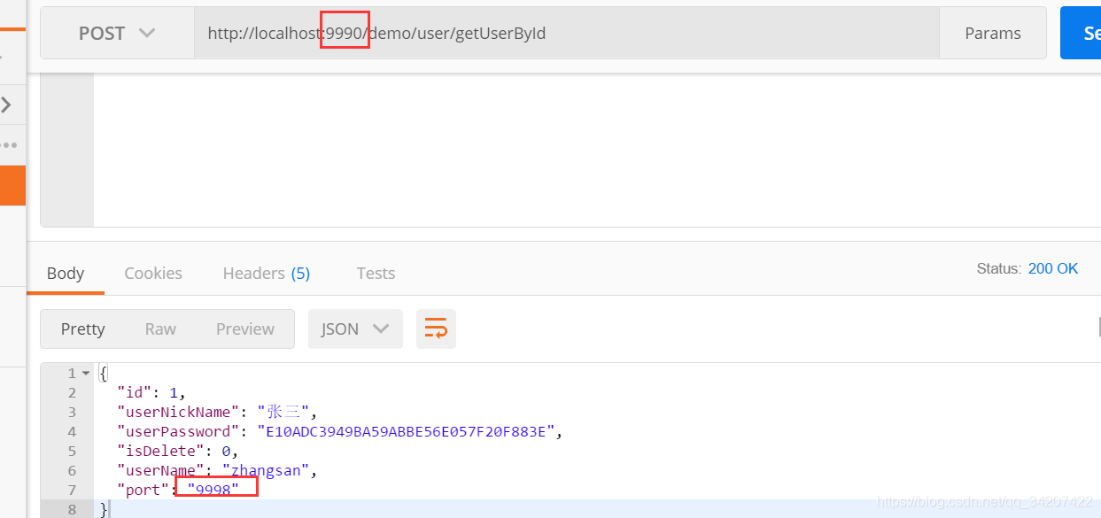 由上面两个图可以看出,访问9990的代理端口时,可以正常且负载均衡的获取9999和9998两个服务。